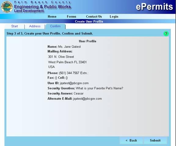 Review the Confirm tab and click the Submit button to complete the registration.