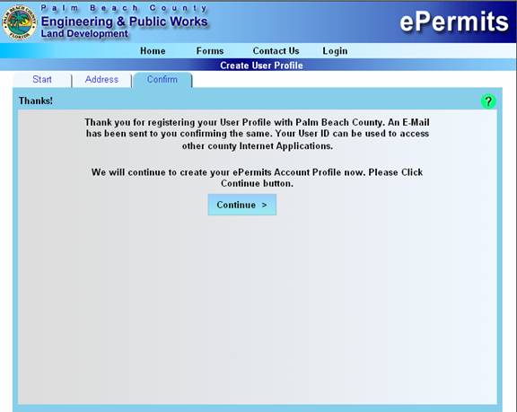 Click the Continue button to proceed with the E-permits account creation.